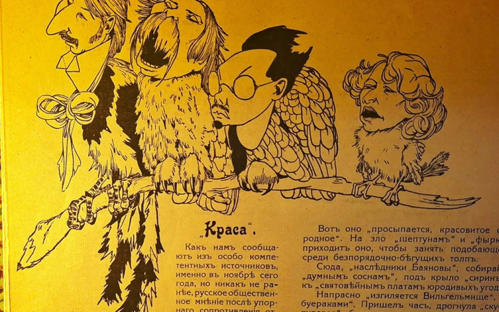 «Черный человек/Черный, черный/Черный человек/На кровать ко мне садится…» Кстати, недавно подробно выяснял обстоятельства первого выступления Есенина в 1915 году на вечере «Краса». Так вот на выставке представили журнальный (отнюдь не комплиментарный) отзыв на «Красу». В нем упоминается, что на вечере в концертном зале Тенишевского училища, «по словам очевидцев», «добрый молодец, млад-Есенин из Рязани потряхивал кудрями русыми, приплясывал ножками резвыми…». Причем к статье присовокупили карикатуру на основных участников, где Есенина изобразили в виде… неоперившегося воробышка.