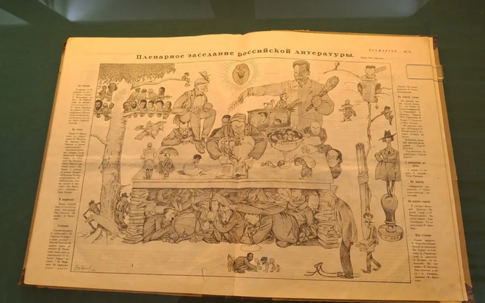 Мало? Получите еще! Карикатурный разворот журнала «Прожектор» изображает «пленарное заседание российской литературы». Горький, как бык, выпускает пар из носа. Лилипут Осип Брик сидит на кепке у Маяковского. Юрий Либединский (автор воспоминаний о Есенине) вылупился из яйца… На дереве на птичьих правах разместился ряд авторов, под ними на аэроплане летит комичный Есенин…