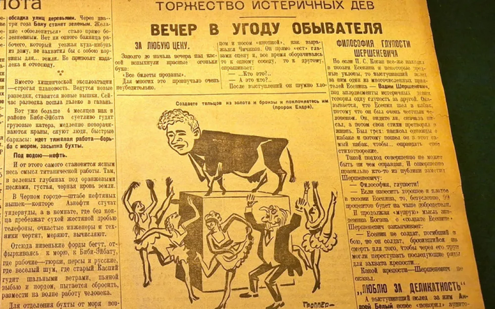 Заголовок весьма показателен. «Есенинщина справляет тризну. Вечер в угоду обывателя». Снова карикатура — Есенин в качестве «золотого тельца». (И это — в годовщину смерти!) Рифмованная подпись: «Москва еще не видела,/Чтоб этак вокруг идола/Плясали в честь «культуры»/Кликушествующие от литературы».
