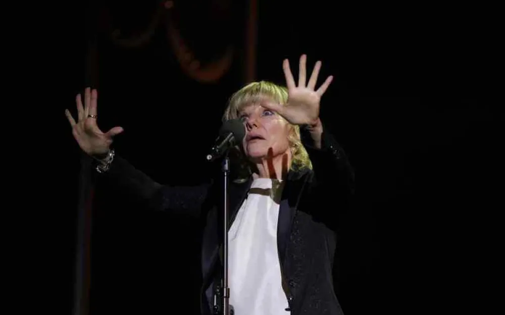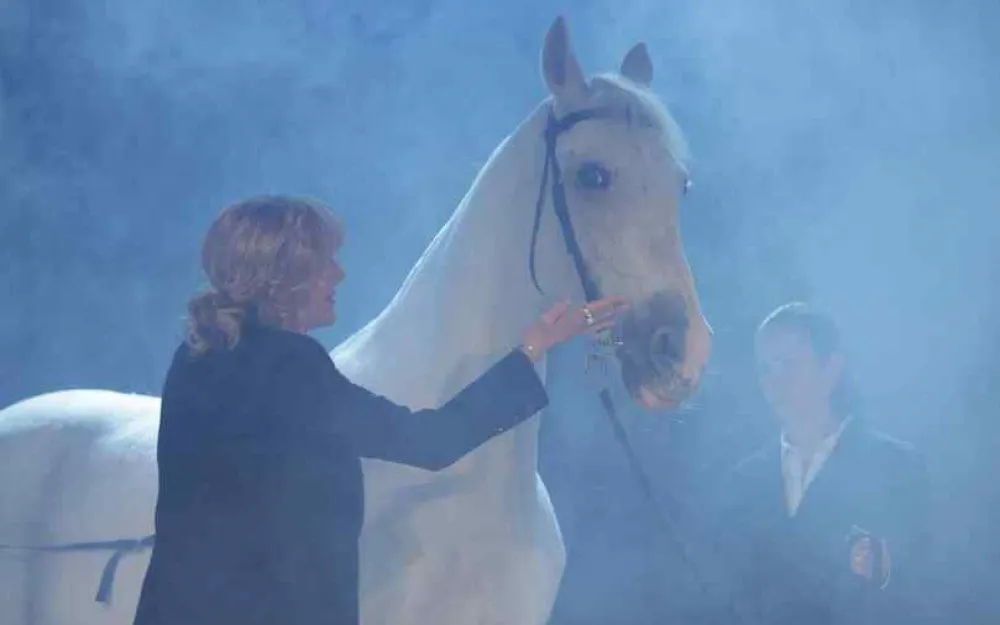 Сцена в черно-бело-голубом свете, нижние дымы красиво создают эффект тумана, из которого выплывает белый конь, который вообще-то был уже заряжен на сцене, но все равно как будто выплывает. Этот конь работает в «Поминальной молитве», и его доставили в театр, чтобы он открывал «Задворки» на сцене вместе с Сашей Захаровой. Она вернулась в театр, ее вернул Панков и отдал ей право вести вечер. А кто, кроме нее, сможет дать такую точную, сдержанную, но искреннюю интонацию любви. И Марк Анатольевич, если помните, писал в своей книге, что «самое главное мое творение в жизни — дочь Александра». И вот она на сцене в элегантном темно-синем брючном костюме.