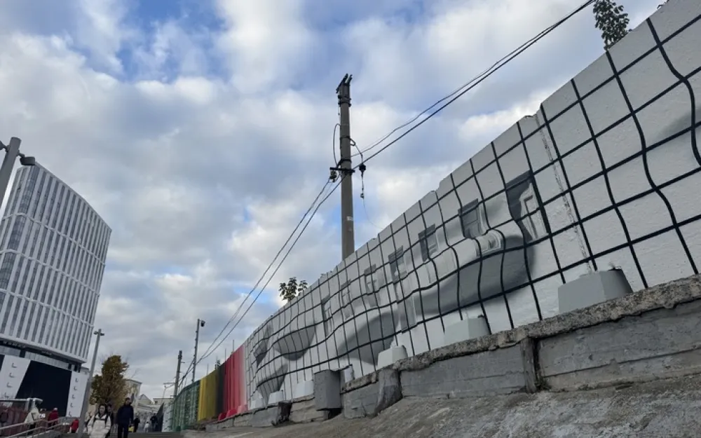 Ритмичную абстракцию продолжает еще один оптический мурал Данилы Shozy, где разлинованная в клеточку поверхность стены снова плывет и будто выступает из стены. Но здесь уже присутствуют фигуративные элементы – и это окна, но уже не панельки. Они напоминают московскую архитектуру ХIХ века. Однако иллюзорное пространство в белую клеточку с окнами и дверью здесь походит на парусящую ткань, напоминая о реставрации исторических зданий в центре города, нередко закрытых баннерами с изображениями условных фасадов.