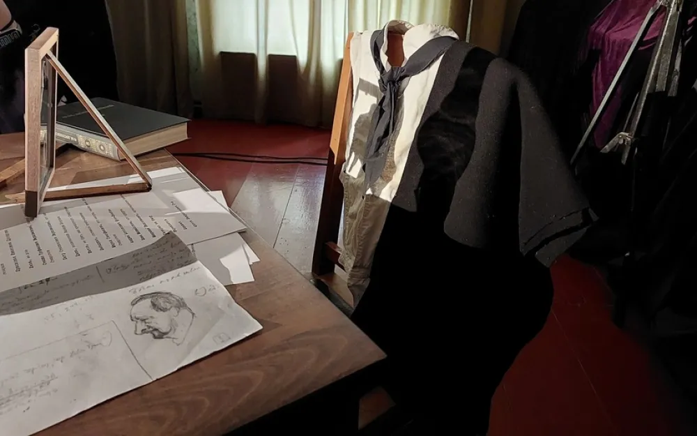 На столе разложены копии эскизов Мстислава Добужинского, созданных к спектаклю Московского Художественного театра «Николай Ставрогин» 1913 года по роману «Бесы» Достоевского. Собственно к 150-летию со дня рождения выдающегося художника и создана инсталляция в Старой Руссе. Сам он представлен не только своими работами, но письмами, прочитанными современными актерами, миниатюрной бумажной фигуркой, установленной на рояле.