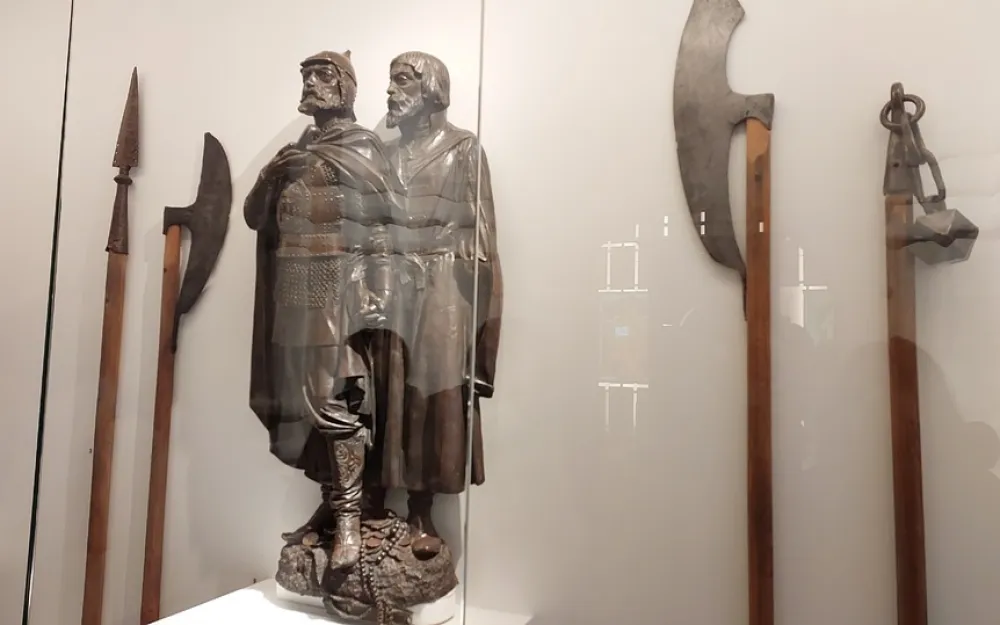 В первом зале посетителей встречает бронзовая скульптура Минина и Пожарского XIX века скульптора Михаила Микешина и небольшая коллекция шлемов, пушка и пушечные ядра.