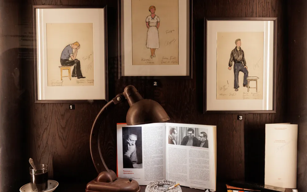 Следующий раздел посвящён легендарным спектаклям. Архивные фото оживают на экранах: «Двое на качелях», «Голый король», «Назначение», «Три сестры», «Пигмалион», «Осенняя соната», «Саша Шиша».