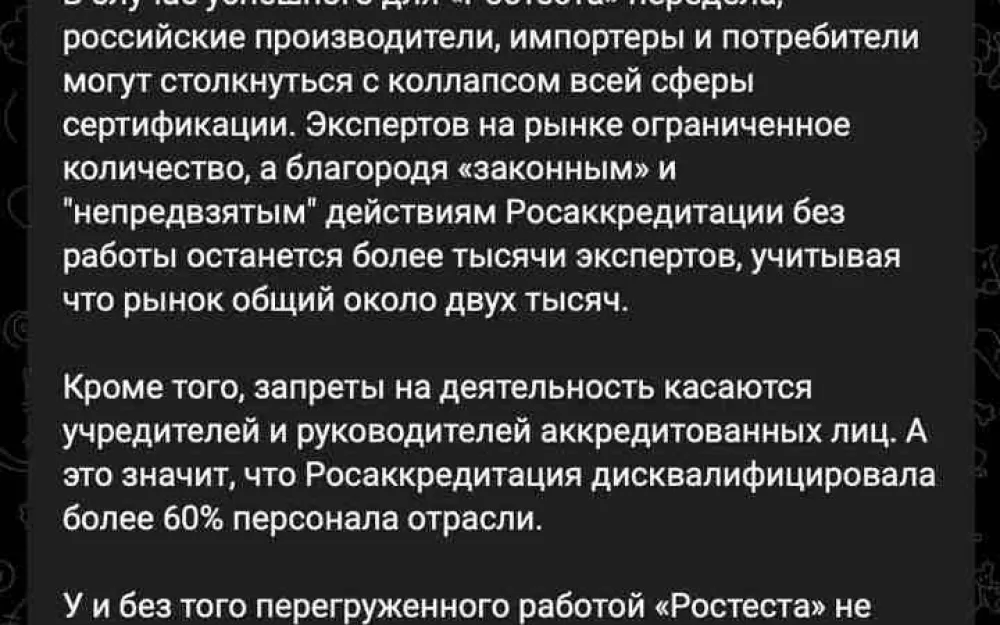 По мнению экономиста Никиты Кричевского, которое он приводит в своем телеграм-канале, российские производители, импортеры и потребители могут столкнуться с коллапсом всей сферы сертификации. Экспертов на рынке ограниченное количество, а благодаря действиям Росаккредитации без работы останется более тысячи профессионалов, учитывая, что общий рынок составляет всего около двух тысяч.