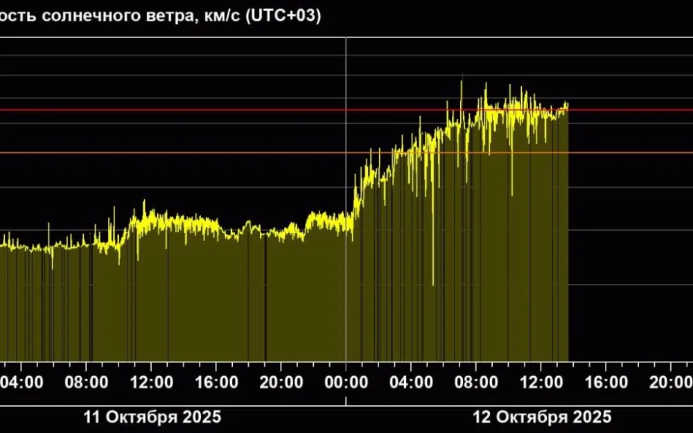 "Планета уже внутри потока плазмы из корональной дыры. Красная линия (на графике скорости солнечного ветра, - ред.) — это отсечка, отделяющая очень высокие скорости солнечного ветра от экстремально высоких, поэтому дует хорошо", - говорится в сообщении в Telegram-канале Лаборатории.