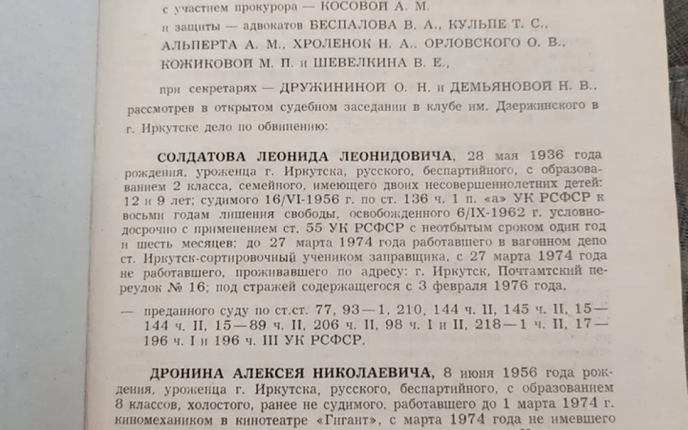 «Следственным отделом по Ленинскому району г. Иркутска СУ СК России по Иркутской области завершено расследование уголовного дела в отношении 65-летнего местного жителя. Он обвиняется в совершении преступления, предусмотренного ч. 1 ст. 105 УК РФ («Убийство»), — эта цитата из пресс-релиза СК от 2 февраля 2022 года. — Известно, что в 70-х годах мужчина входил в банду Солдатова, был правой рукой лидера. На счету банды более 200 эпизодов преступлений, среди которых несколько жестоких убийств. В 1978 году мужчина был приговорен к 15 годам лишения свободы. Освободившись из колонии, он еще несколько раз попадал в поле зрения правоохранительных органов. В 2002 году освободился после отбывания наказания за совершение убийства».