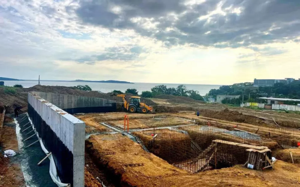 Сейчас ведутся работы по устройству пристенного дренажа, рабочие армируют фундамент, роют траншеи под канализацию, заливается фундамент под кафе, фонтан и видовую площадку. На данный момент есть некоторые проблемы с водоотведением, но они решаемы.