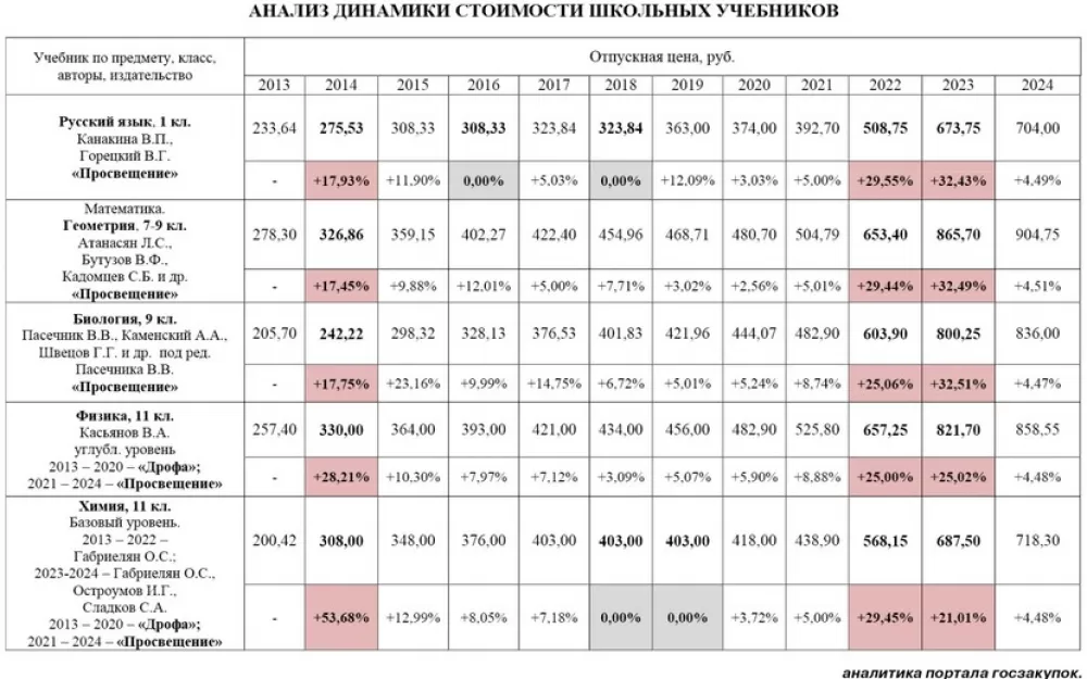 За последние несколько лет, после чреды продаж и перепродаж пакетов акций, издательство «Просвещение» почти полностью перешло под контроль государства. Но это никак не сказалось на закупочных ценах учебников. Например, за период 2013-2024 стоимость одного и того же учебника геометрии, с одним и тем же авторским коллективом и в том же самом издании, изменилась с 278,3 рублей до 904,75.