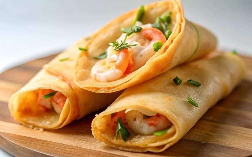 Обжарьте мелкие креветки с луком и чесноком, добавьте сливки или сметану, посыпьте тертым сыром. Заверните в блин, как в мешочек, и скрепите.