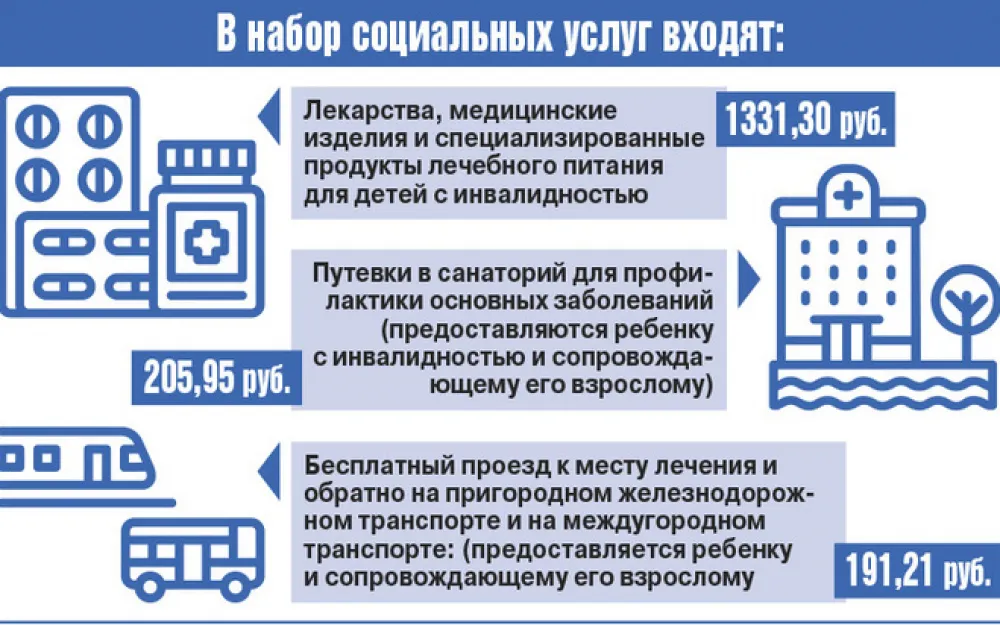- Путевки в санаторий для профилактики основных заболеваний (предоставляются ребенку с инвалидностью и сопровождающему его взрослому) — 205,95 руб.