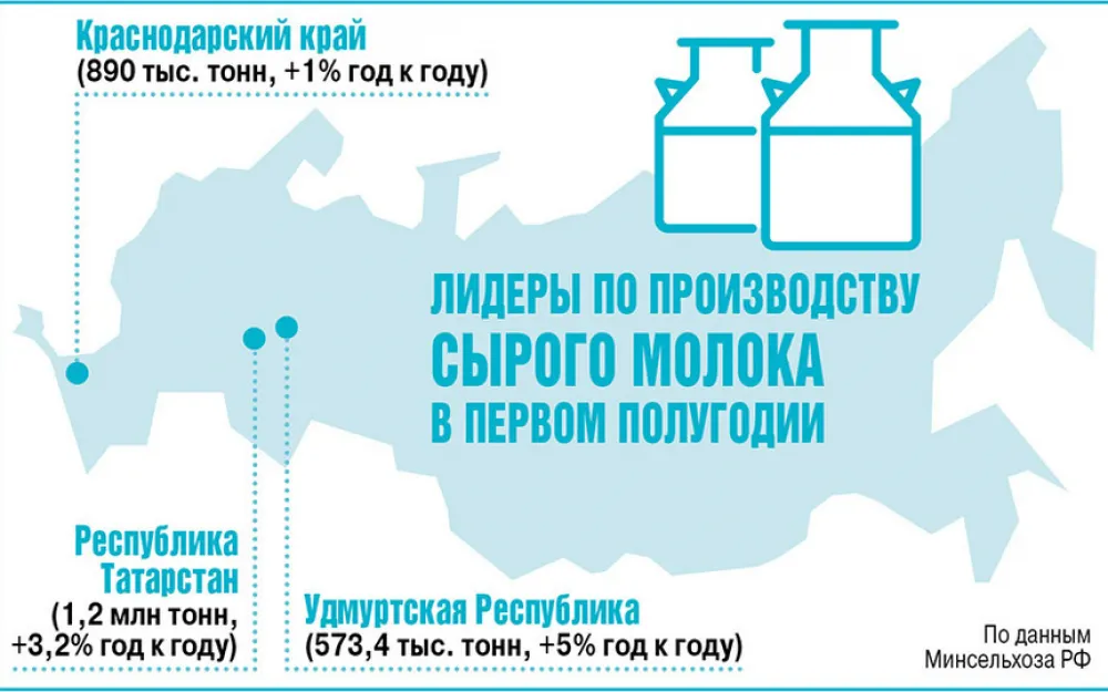 «Лидерами по производству сырого молока в первом полугодии стали Республика Татарстан (1,2 млн тонн, +3,2% год к году), Краснодарский край (890 тыс. тонн, +1%), Удмуртская Республика (573,4 тыс. тонн, +5%).