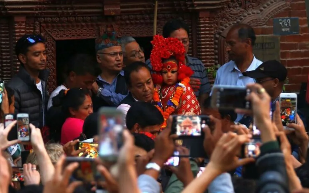 Во время фестиваля Индра-Джатра в начале этого месяца верующие катали бывшую Кумари на колеснице, которую тянули за собой. Кумари всегда носит красное, завязывает волосы в пучок на макушке и рисует на лбу “третий глаз”.