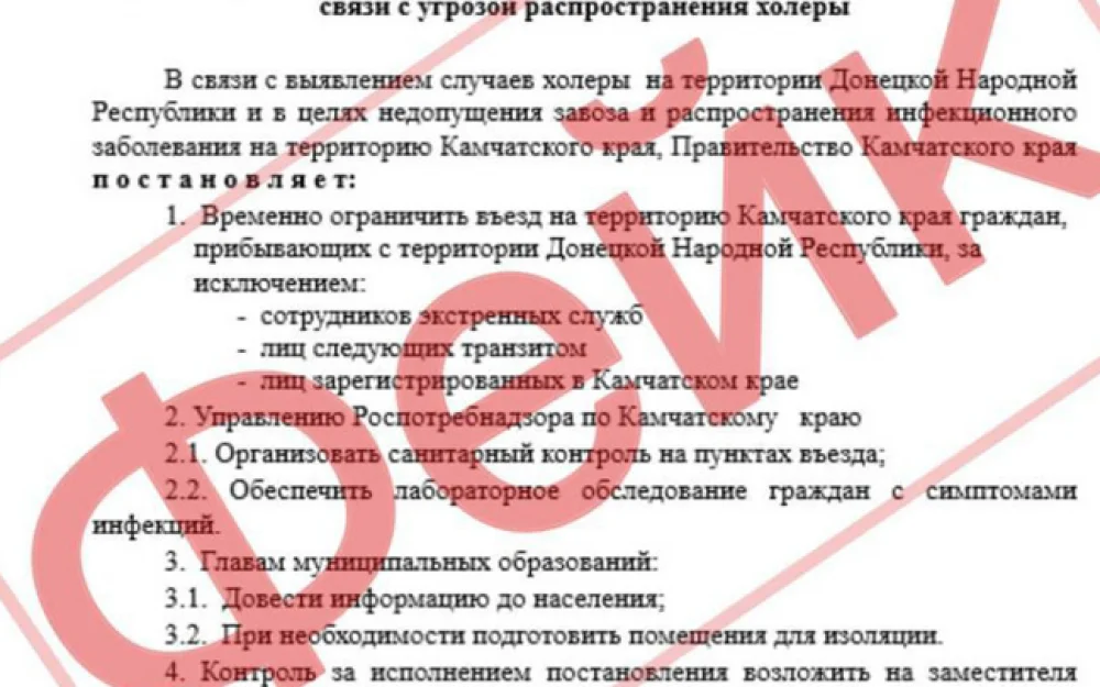В Telegram-канале Министерства здравоохранения Камчатского края опровергли появившуюся в интернете информацию о том, что граждане из ДНР якобы не могут посетить регион из-за вспышки в республике эпидемии холеры.
