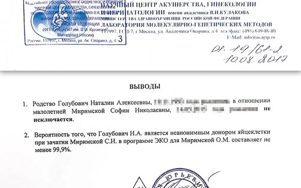 Исследование генетических локусов проводилось в специализированном федеральном центре, куда направлялись биоматериалы ребенка, Голубович и образцы, необходимые для сравнительного анализа. Экспертиза установила совпадения, позволяющие считать Наталию Голубович биологической матерью девочки с вероятностью, приближающейся к полной. Иными словами, речь шла не о косвенных данных, а о научно подтвержденном факте. В документе эксперты формулируют вывод четко и без оговорок. «При анализе 15 локусов у Голубович Н.А. и Миримской С. Н. установлены генотипы, которые позволяют сделать вывод об их биологическом родстве по материнской линии. Вероятность родства по материнской линии — 99,999%» (источник: из заключения ДНК-экспертизы ФГБУ «НМИЦ АГиП им. Кулакова»).