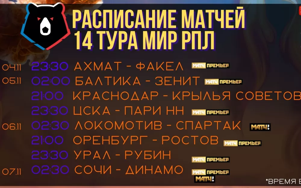 В субботу, 4 ноября, стартует 14-й тур РПЛ сезона 2023/24. Новый этап чемпионата поможет вернуть интригу в борьбу за лидерство в турнирной таблице, сообщает Спорт 25.