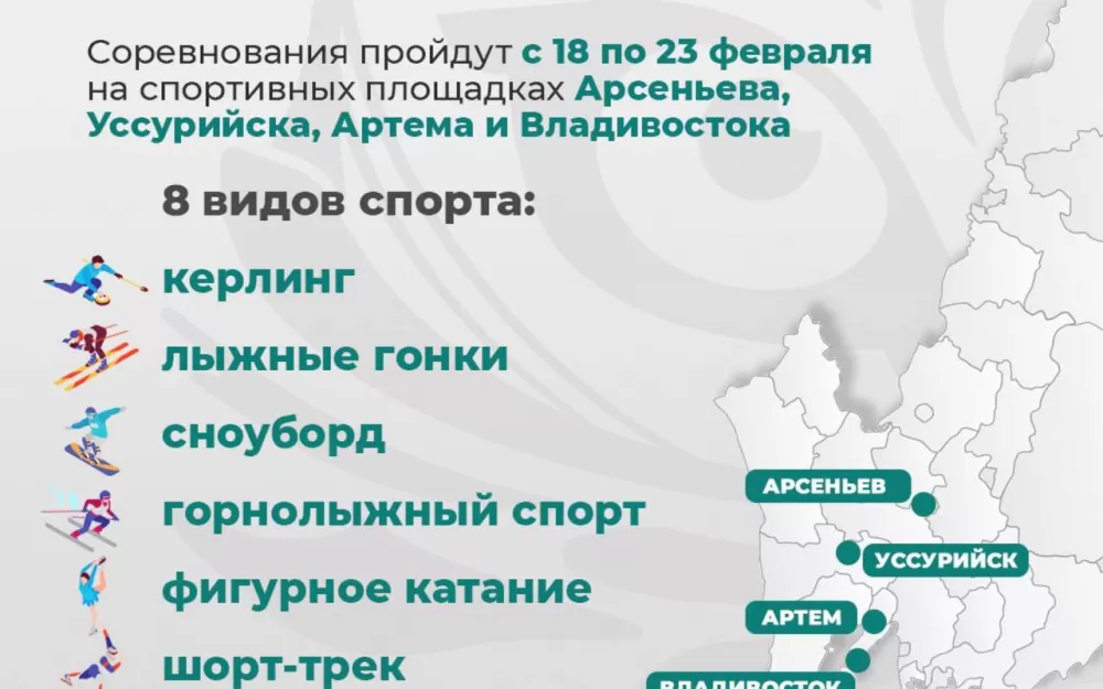 В Приморском крае начался обратный отсчет до старта первых Зимних игр «Дети Приморья». Детский спортивный форум пройдет с 18 по 23 февраля 2024 года. Сразу четыре города станут хозяевами соревнований. Розыгрыш медалей в 8 видах спорта пройдет во Владивостоке, Артеме, Уссурийске и Арсеньеве.