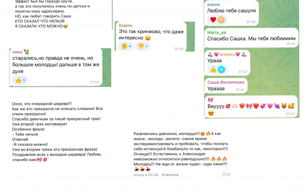 «С безумным трепетом мы готовы представить вам нашу песню! Для нас это не просто совместная работа, а трансформация нашей дружбы во что-то большее! Искреннее спасибо автору и продюсеру Вадиму Антонову за то, что помог передать наши мысли и желания», – прокомментировала новую работу в своём ТГ-канале Александра Трусова.
