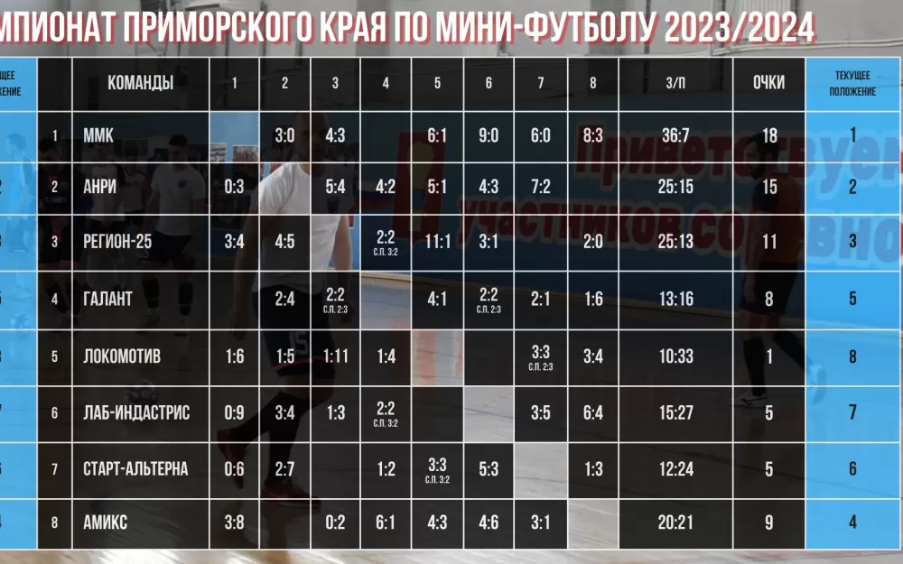 В воскресенье в Уссурийске продолжились матчи в рамках 6 тура чемпионата. «ММК» одержал шестую кряду победу, в этом туре дружину Никулина не смог остановить «Амикс». Игра началась с хет-трика от Терещенко. Игроки «Амикса» пытались навязать борьбу, но все же уступили со счетом 3:8.