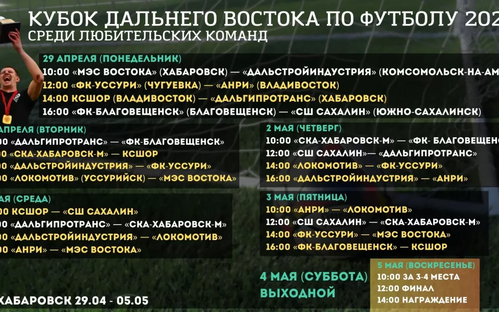 С 29 апреля по 5 мая на стадионе «Юность» в Хабаровске состоятся Межрегиональные спортивные соревнования «Кубок Дальнего Востока» по футболу среди любительских команд. Дальневосточный футбольный союз опубликовал расписание матчей турнира, сообщает Спорт 25.