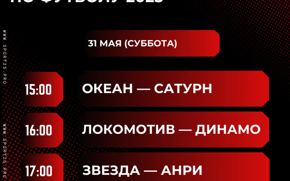 Игровой день откроется в 15:00 на стадионе «Водник» в Находке, где сойдутся два местных клуба — «Океан» и «Сатурн». Внутригородское дерби обещает бескомпромиссную борьбу за важные очки. Главным арбитром встречи назначен Павел Курило, на линиях ему помогут Владислав Финаев и Илья Богданов.