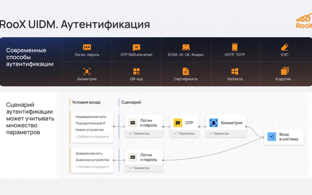 RooX UIDM можно настроить такие сценарии, более того, использовать разные ветки сценариев в зависимости от контекста действия. Например, ограничить права сотрудника и попросить ввести дополнительные факторы аутентификации, если он заходит из недоверенной сети.