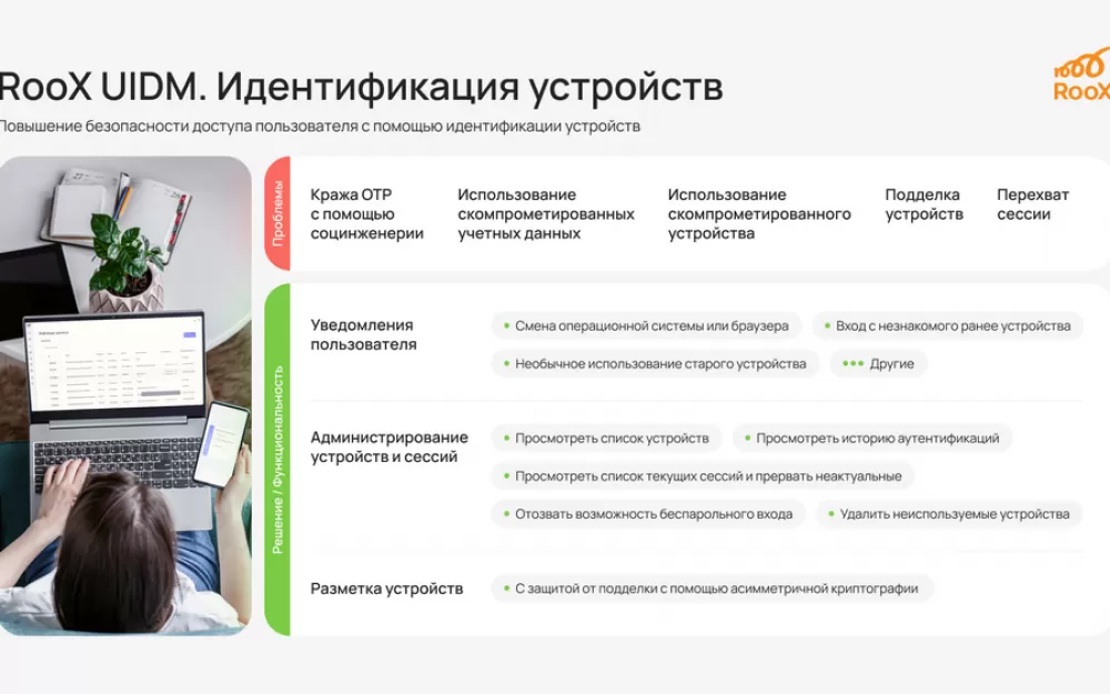 Функция идентификации устройства в RooX UIDM помогает обеспечить защиту от таких распространенных векторов атак, как социальная инженерия, использование скомпрометированных учетных данных, перехват сессии, использование скомпрометированного устройства.