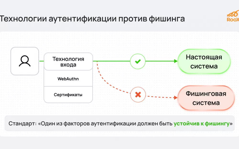 Что же делать, если негде поставить барьер? Здесь помогут технологии беспарольного входа, доступные в RooX UIDM. Они не требуют от пользователя ввода учетных данных. Примером такой технологии является WebAuthn. Это протокол, который позволяет безопасно сохранять на устройстве идентификационные данные пользователя и использовать их для входа исключительно на тех сайтах, с которыми они были ассоциированы. Доступ к этим данным обеспечивается через защитные механизмы, предоставляемые устройством, такие как биометрия (например, FaceID, TouchID), графические ключи и другие.