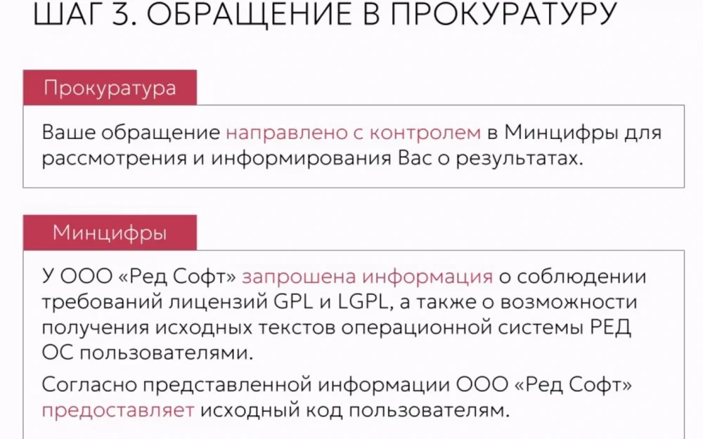 В ответ компания пообещала предоставить исходники, но так и не предоставила. После этого юристы обратились в Генпрокуратуру и Минцифры. Генпрокуратура перенаправила обращение в Минцифры, оно провело анализ и выдало заключение, что продукты «Ред Софт» соответствуют критериям включения в Реестр отечественного ПО. В ведомстве никак не комментировали вопрос о предоставлении исходных кодов и соблюдения требований лицензии GPL.